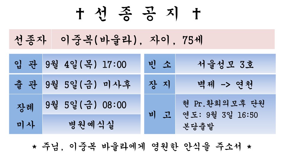 故 이중복 바울라 페이지 정보 작성자 admin 댓글 0건 조회 254회 작성일 25-09-03 17:41 본문 1 목록 이전글故 박금임 마리안나 25.09.21 다음글故 고웅진 마리아 25.06.14