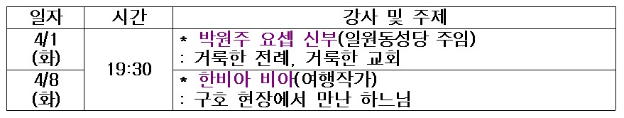 2025년 사순 특강 페이지 정보 작성자 admin 댓글 0건 조회 1,889회 작성일 25-03-12 14:33 본문 목록 이전글희년, 이탈리아 성모성지순례 안내 25.03.12 다음글'여의도동성당 50년사' 책 사전예약 25.03.12